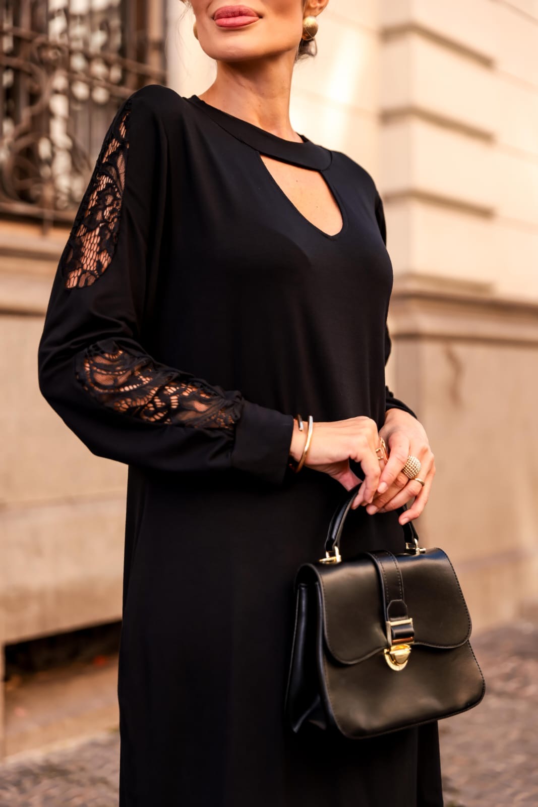 - Detalhes em renda nas mangas e punhos