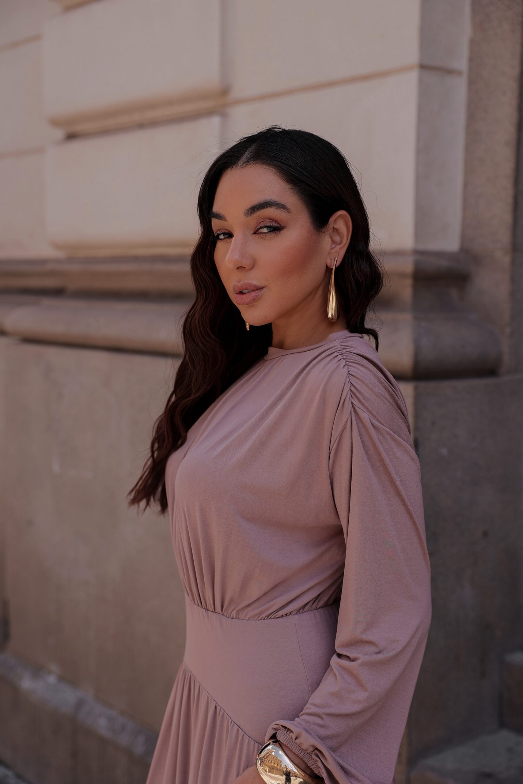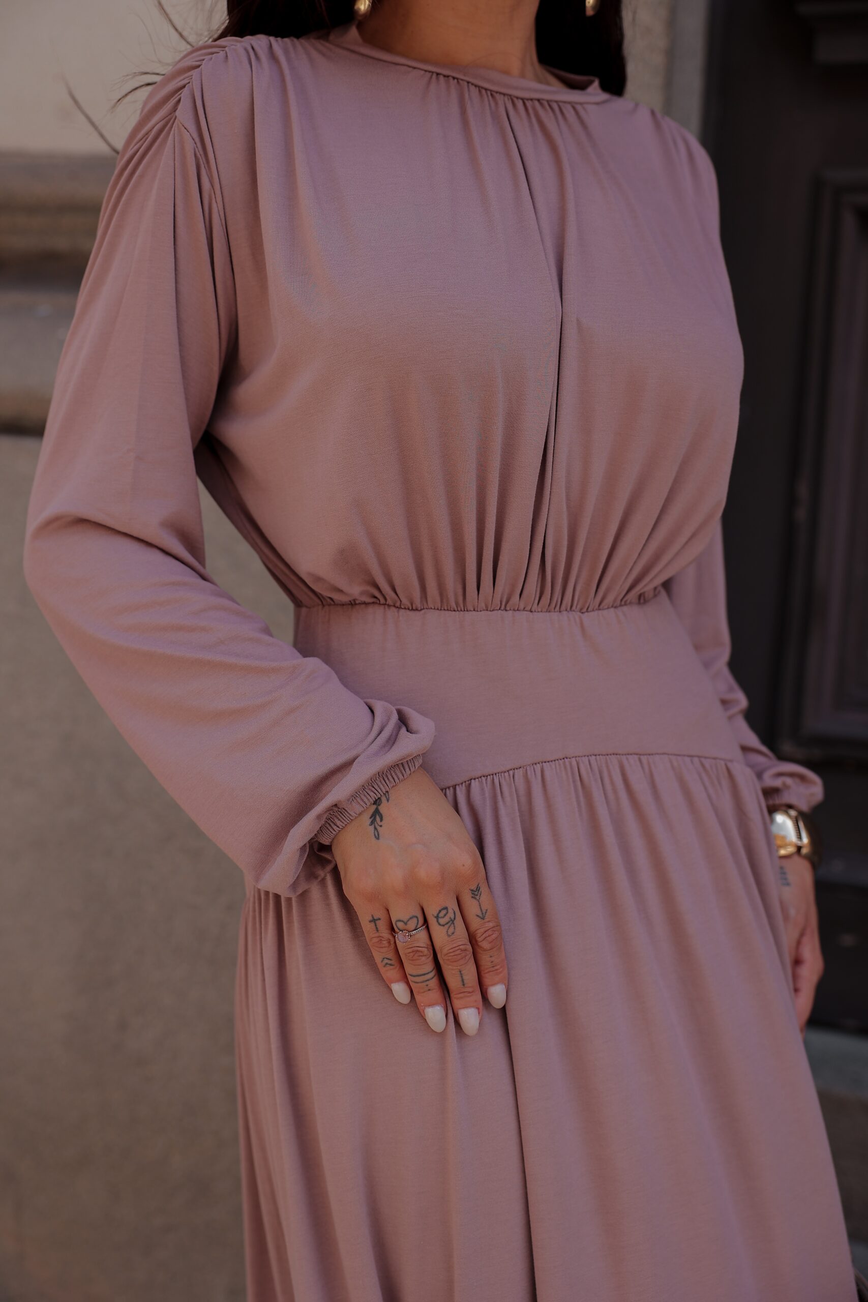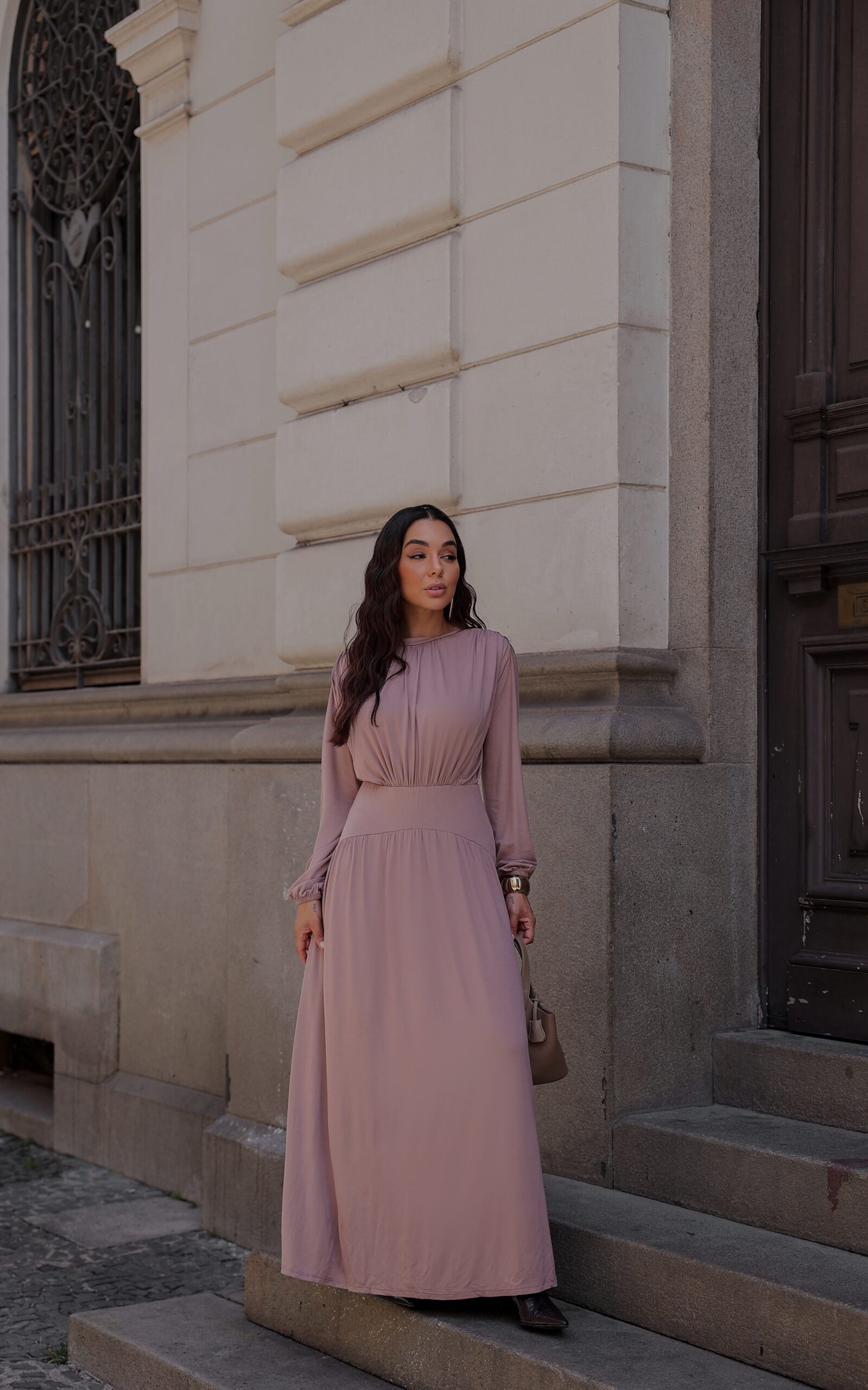 Em viscolycra premium, com modelagem longa e elegante. Possui drapeado nos ombros e mangas com elástico, trazendo movimento e sofisticação à peça.